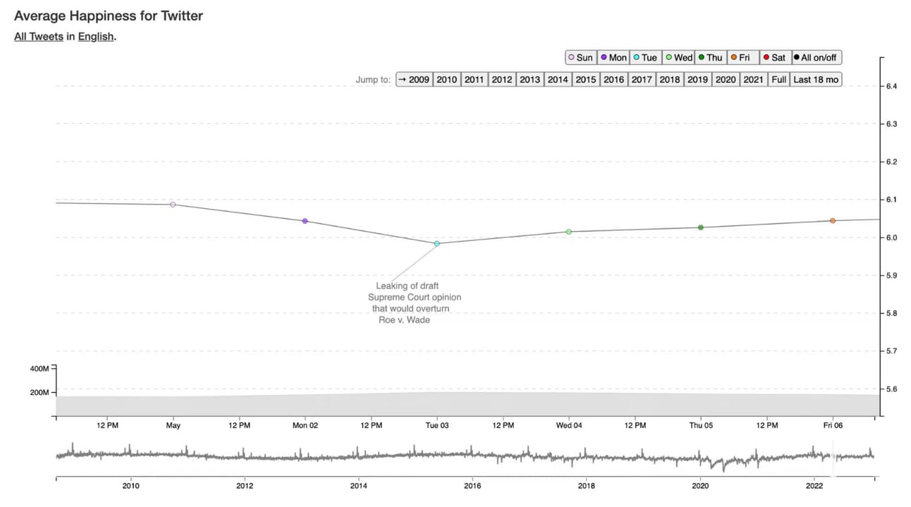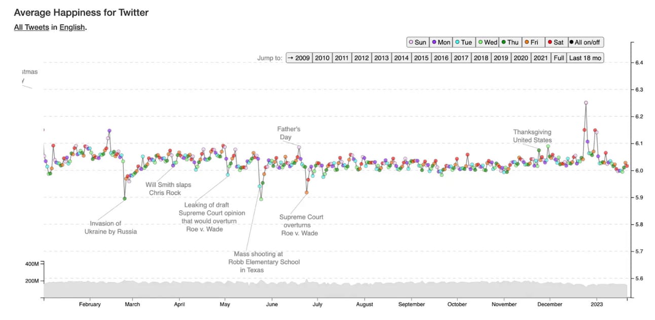 Here’s the Hedonometer’s results from an 18 month span in 2022, when I first published this piece.