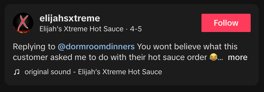Elijah’s Xtreme Hot Sauce does a great job hitting your feels as hard as your taste buds. You’ll hear mentions of Dad, friends, company mistakes, attempts at cool new goodness, and everything else on their TikTok.