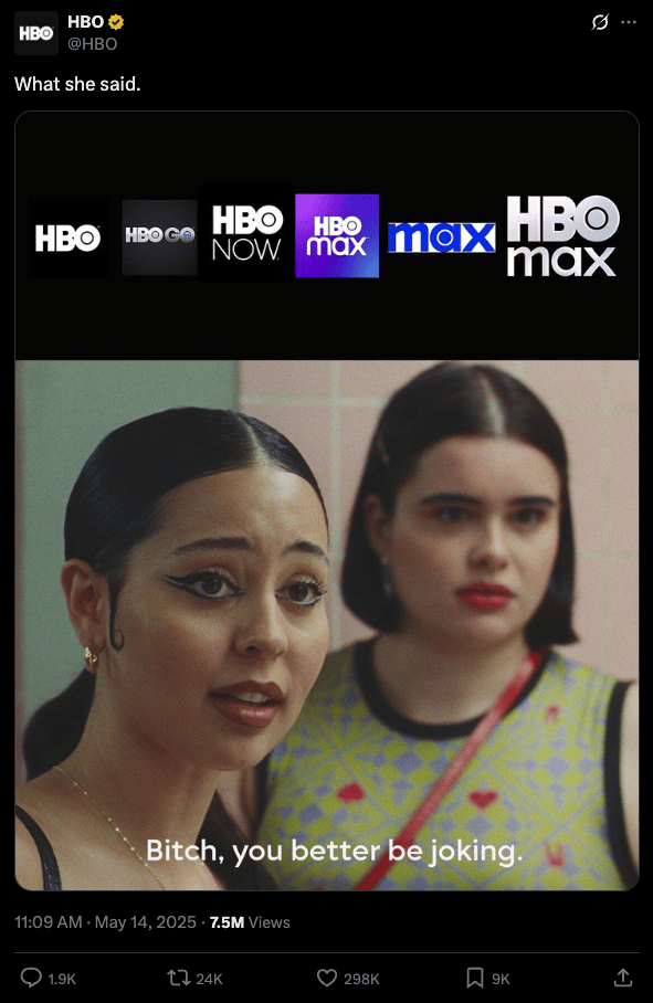 Not my words! That’s Maddy to Sydney Sweeney in Season 2 of Euphoria… and also, Maddy to her streaming service’s choice this week to re-brand back to HBO Max in what’s maybe my favorite social campaign of the year.