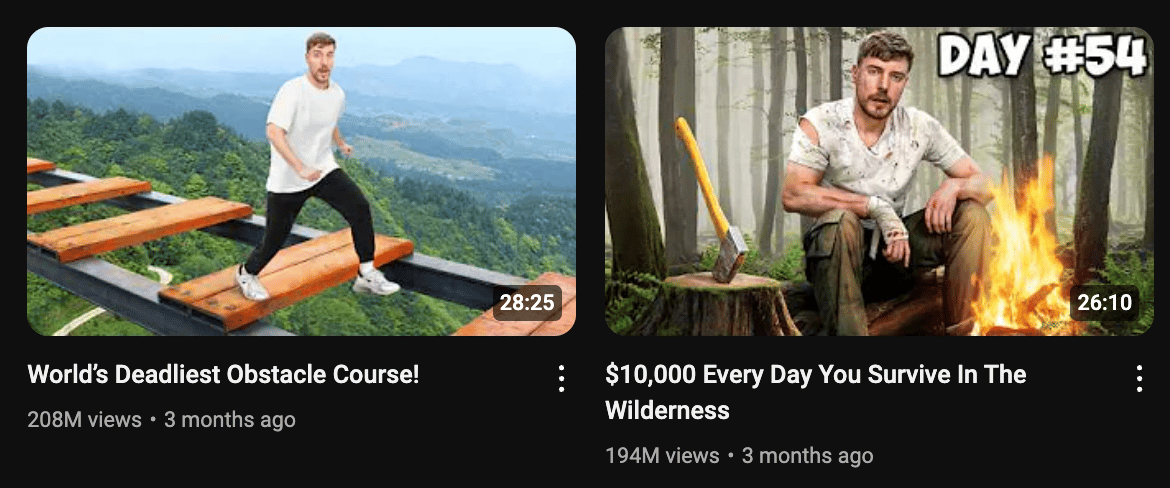 For most brand social accounts, you’ll have a handful of content pillars—buckets of similar content, usually for ease in creation. In MrBeast’s world, they’re “formats,” and they’re proven techniques to go viral every time.