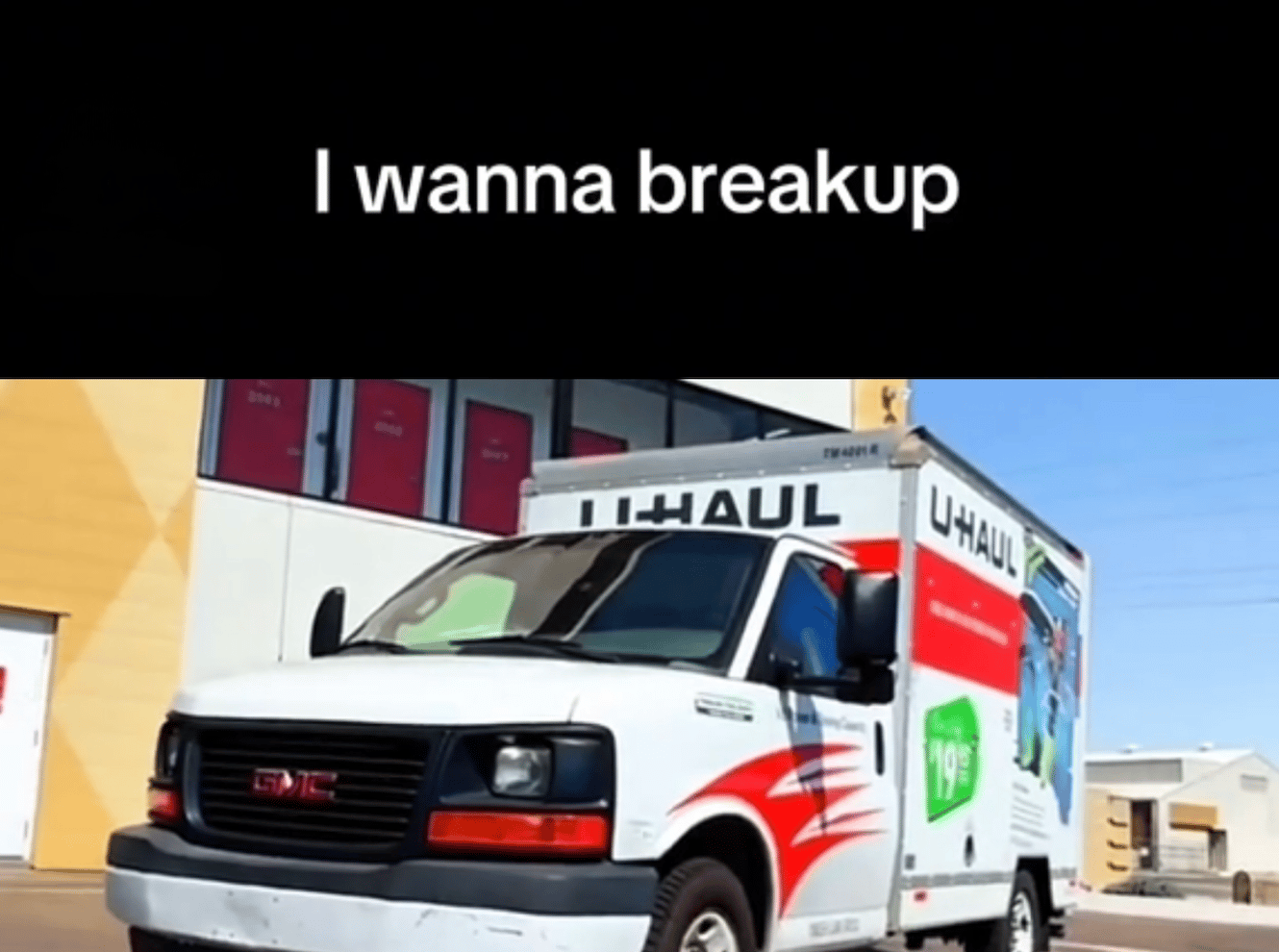 The TikTok opens with a movie title card “I wanna break up” before bringing in an opening lens of a U-Haul truck as the audio continues. Actually, here, just give it a watch.